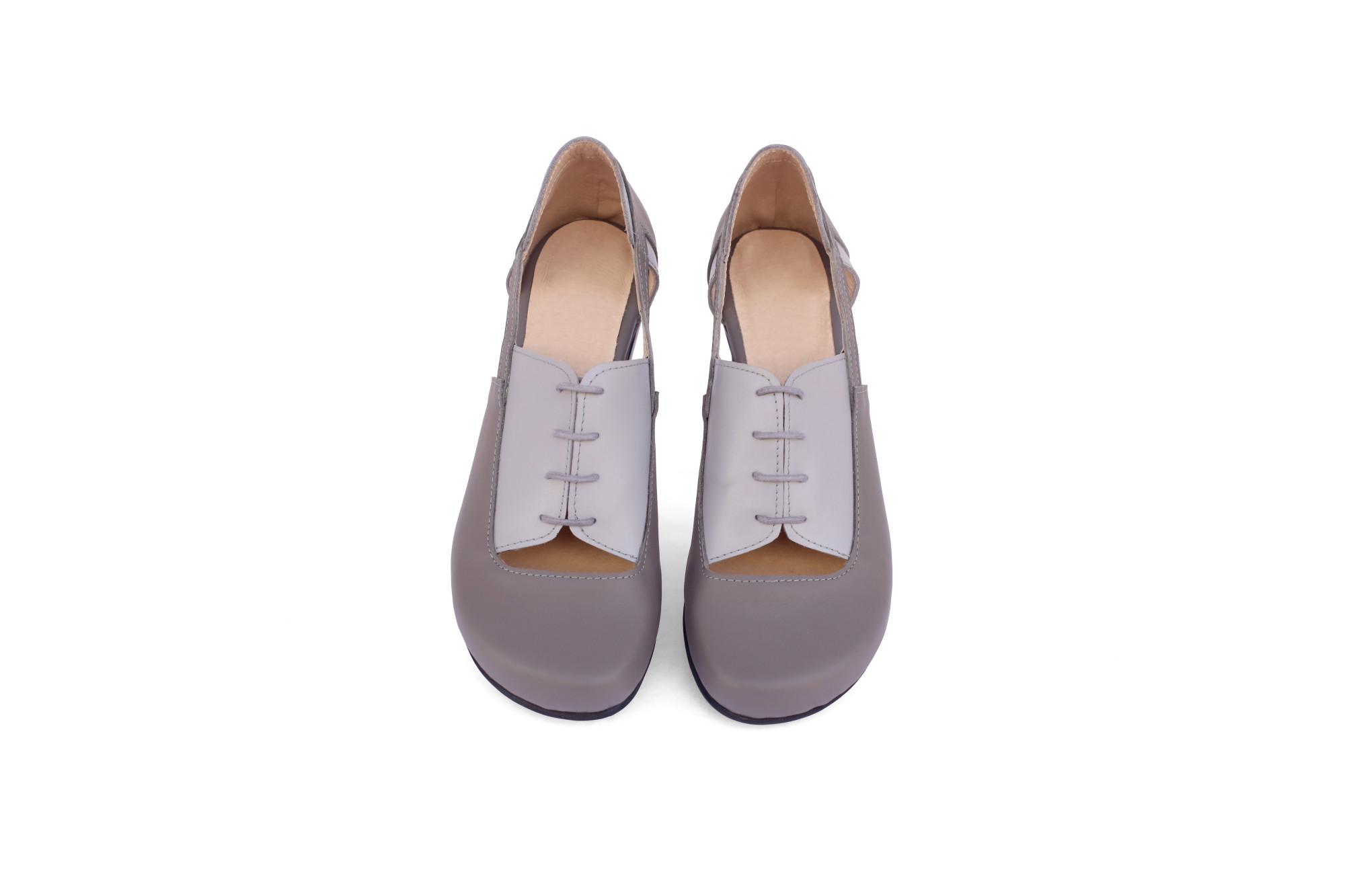 נעלי עור לנשים בעיצוב אלגנטי ומודרני בגווני אפור ואפור בהיר. הדגם משלב שרוכים קדמיים עם פתחים צדדיים המעניקים לנעל מראה קליל ומאוורר לצד קווים נקיים ומדויקים.