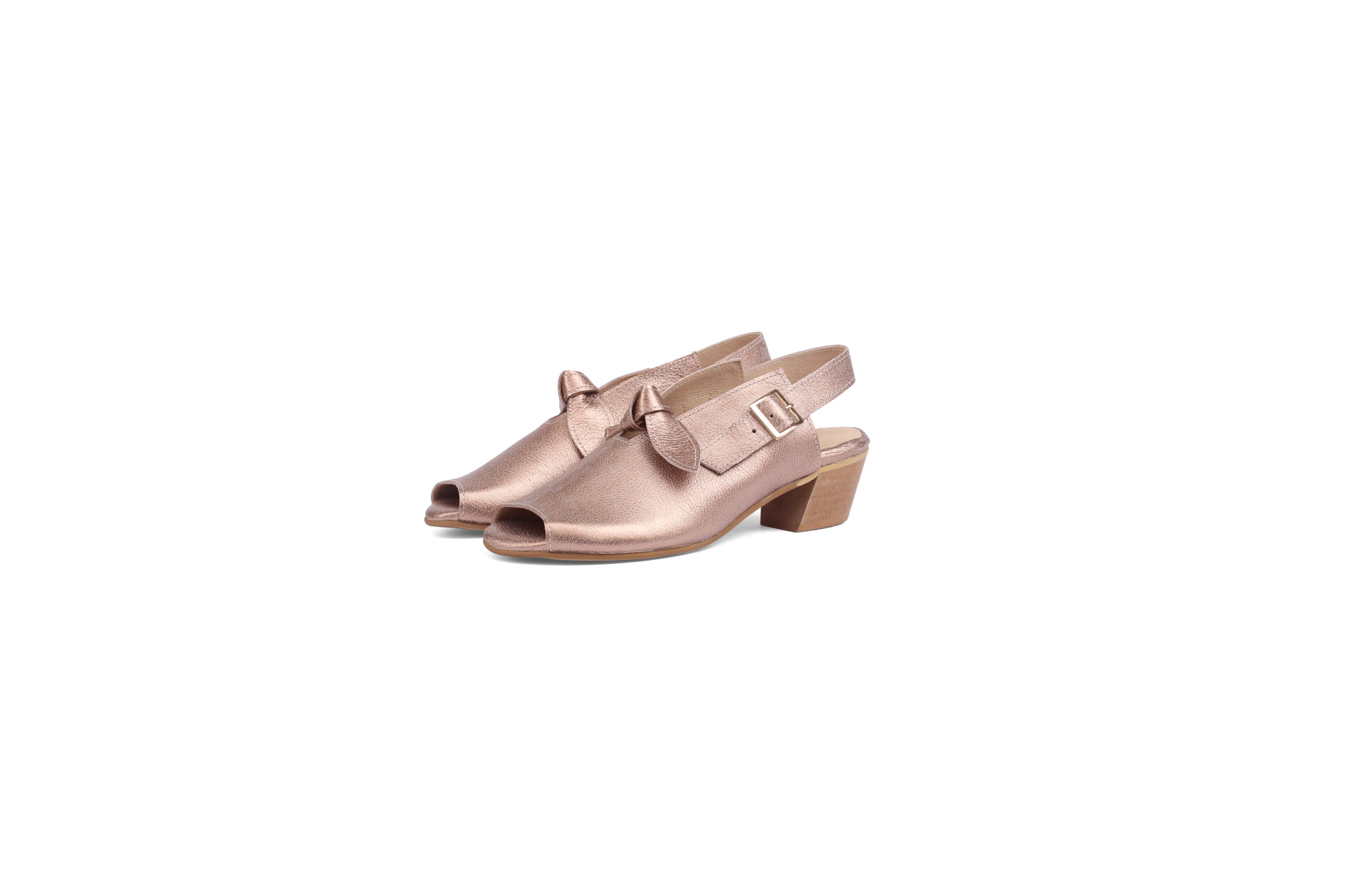 סנדל עור לנשים ורוד מטאלי עם פפיון ואבזם – עקב בינוני