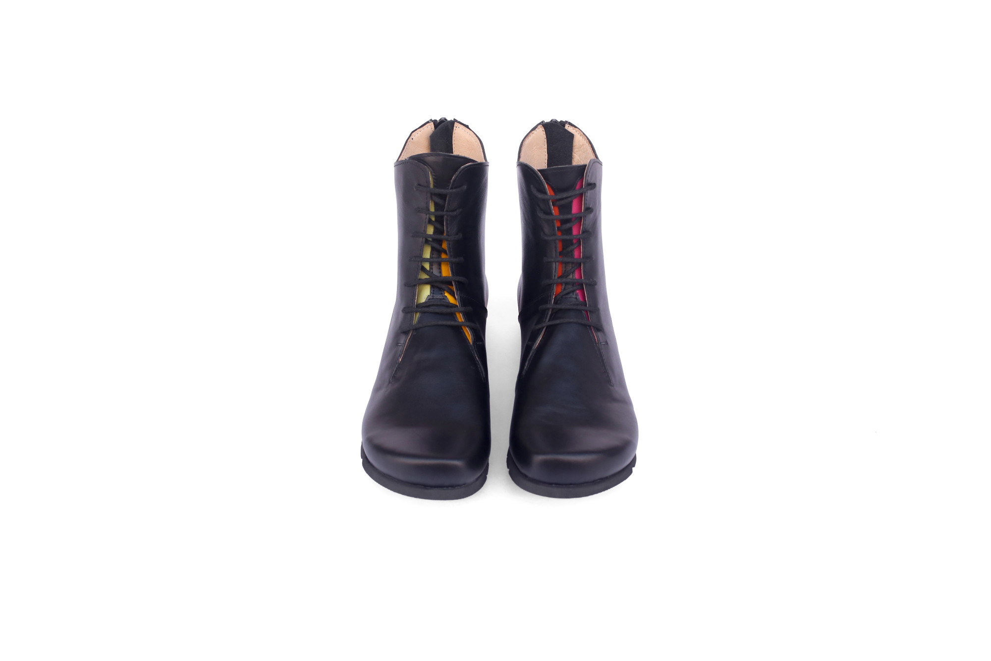 מראה שחור קלאסי מבחוץ – והפתעה צבעונית מבפנים. מגפונים שטוחים עם סוליית EVA נוחה, רוכסן אחורי, שרוכים, ולשון דו-צדדית בצבעים חיים שמשלבים בין אומנות לנוחות יומיומית.