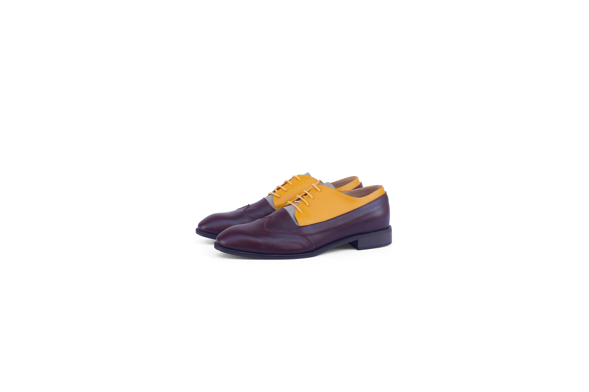 Men’s leather shoes featuring a refined blend of deep eggplant, warm mustard, and soft light grey. The elegant color combination adds character and distinction to a classic silhouette, making these shoes suitable for both everyday wear and smart occasions.