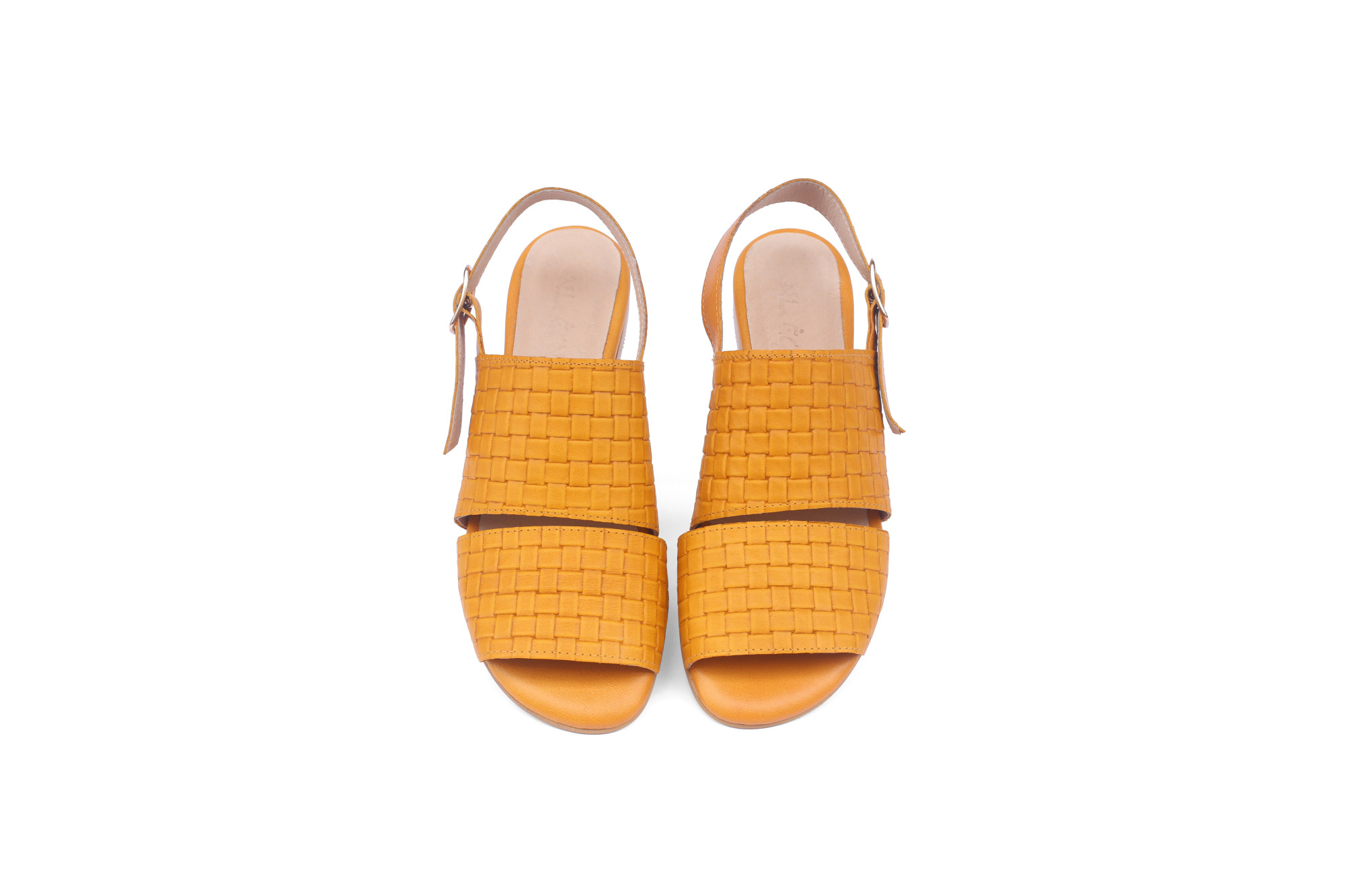 Women’s sandals crafted from mustard yellow leather, featuring a woven front design that adds texture and visual interest.