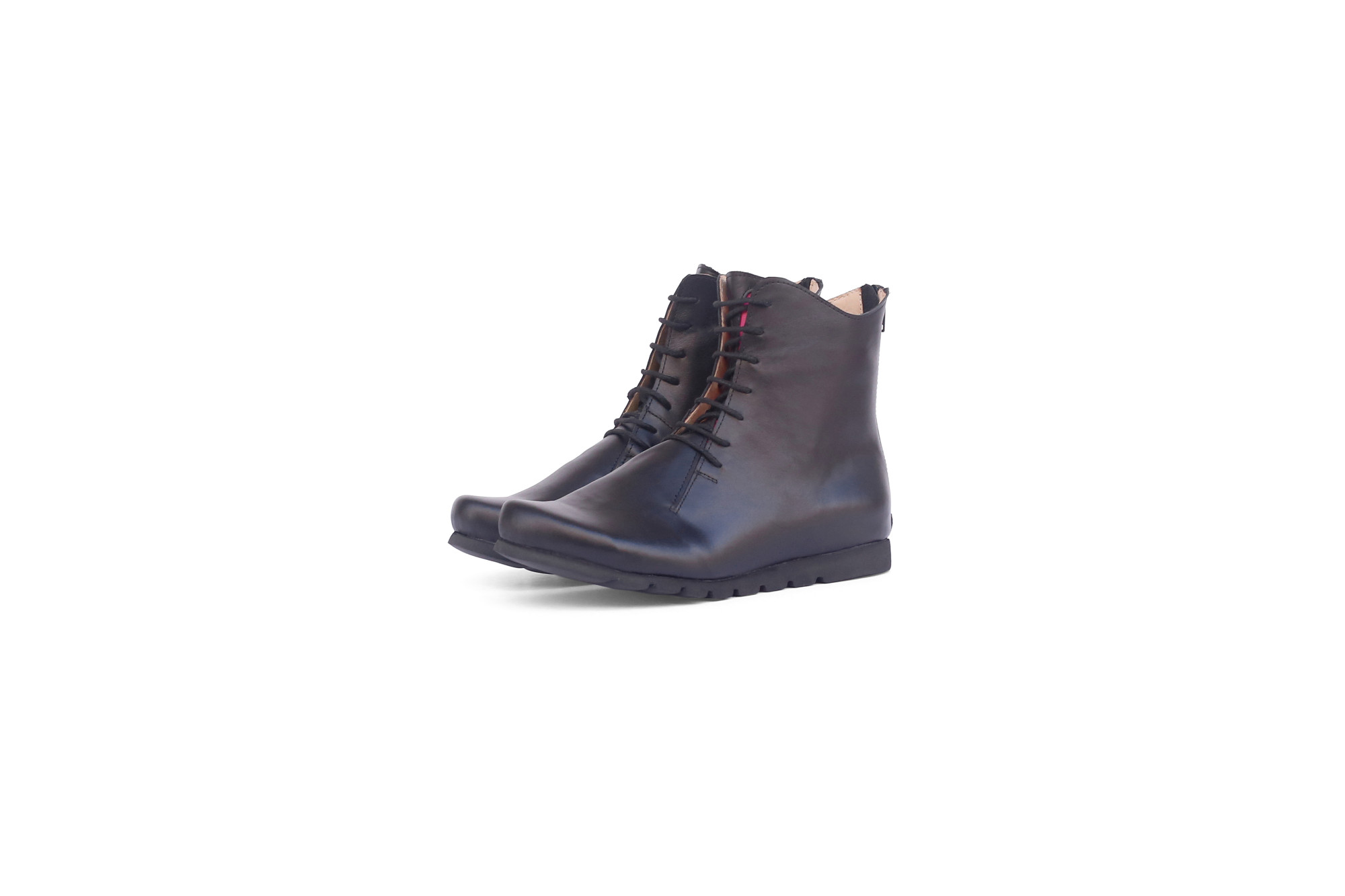 Classic black on the outside, colorful flair on the inside. These handmade leather boots feature a soft EVA sole, laces, and a playful multicolor tongue—green & yellow on one shoe, orange & fuchsia on the other.